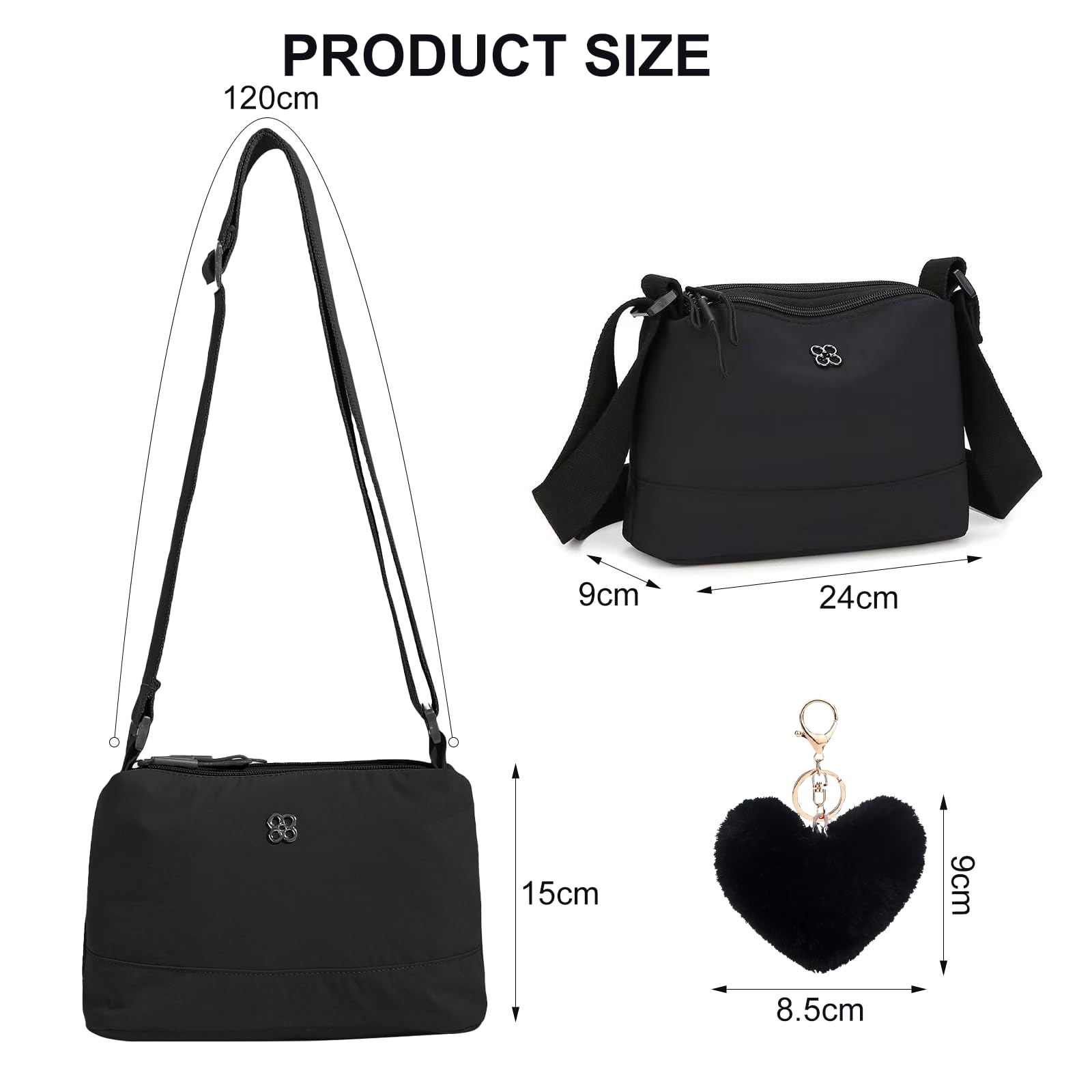 Bolso Bandolera Cruzado HENGBIRD para Mujer en Nylon Negro con Encanto de Corazón – Mediano, Multibolsillos y Bandolera Ajustable