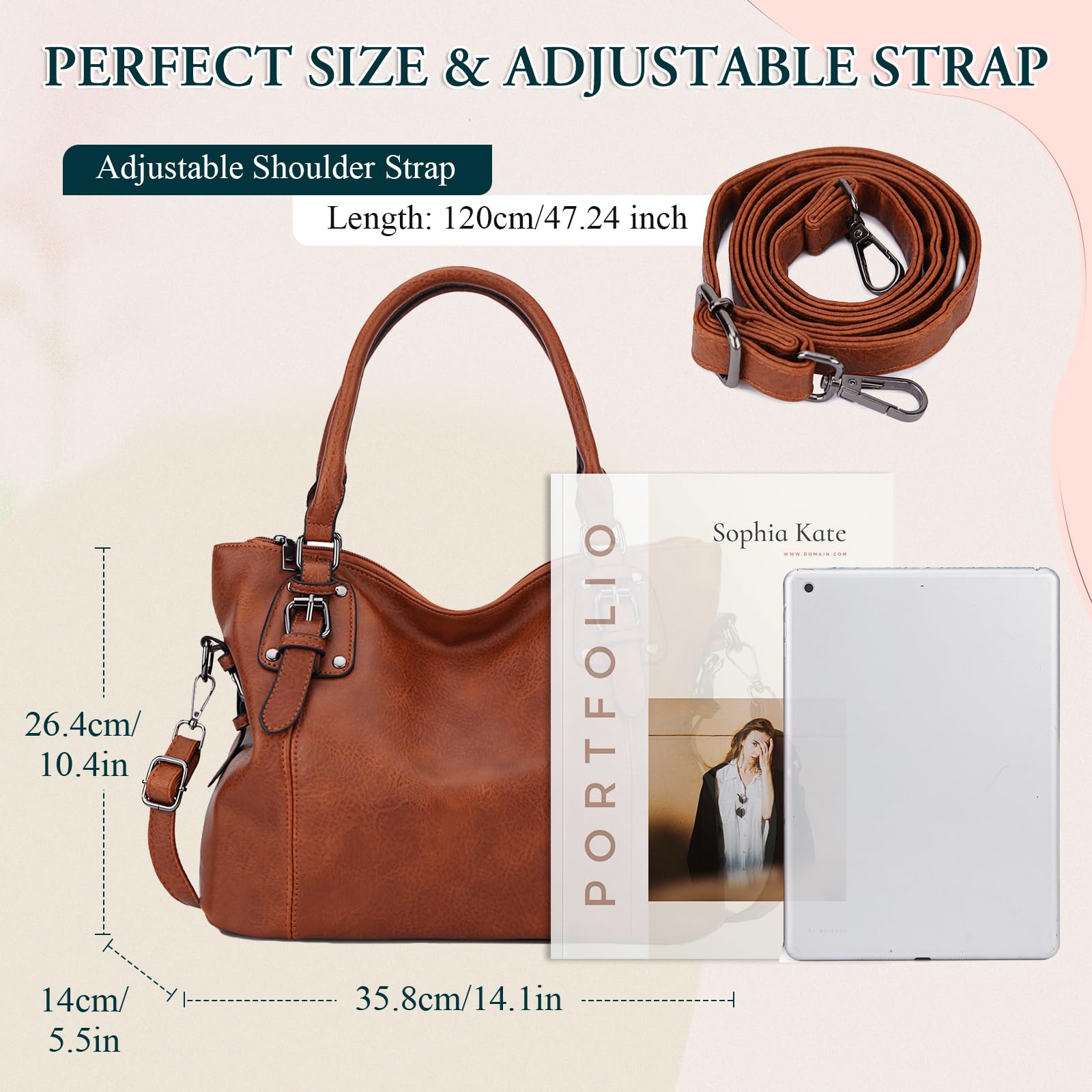 - AJUSTE PERFECTO: Este bolso mujer grande tiene unas dimensiones de 14.1 x 5.5 x 10.4 pulgadas (35.8 x 14 x 26.4 cm) y un peso ligero de 1.68 lb (0.76 kg), lo que lo hace práctico y fácil de transportar. La correa ajustable para el hombro tiene una longitud máxima de 21.7 pulgadas (55 cm) y es desmontable, lo que le brinda versatilidad para usarlo como bandolera o bolso de mano. Además, su asa duradera asegura un agarre cómodo y seguro en todo momento.