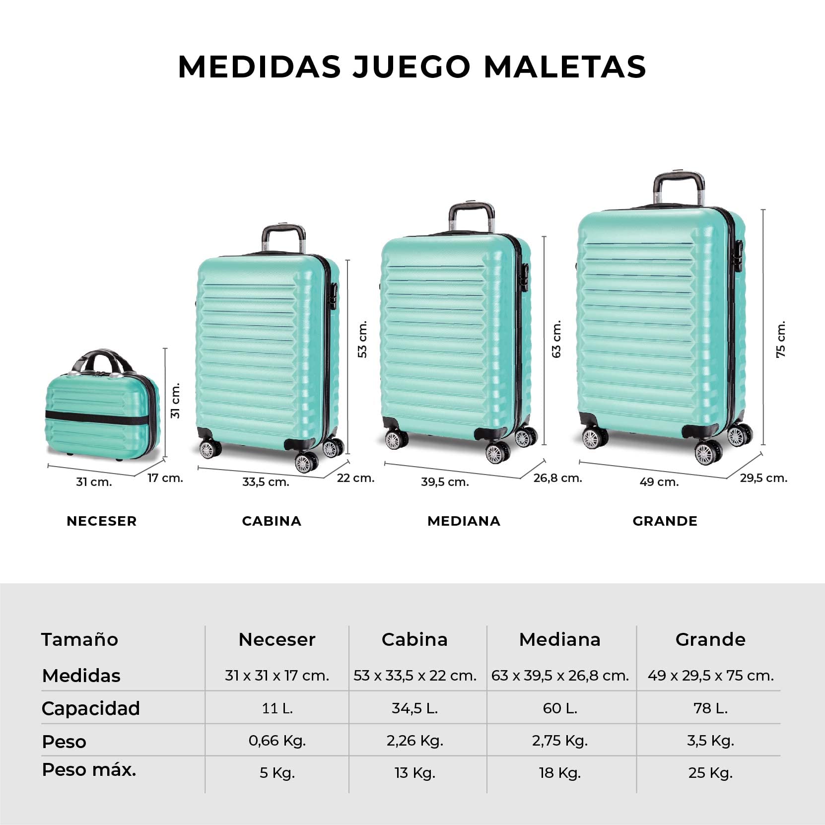 - JUEGO DE MALETAS RIGIDAS: Viaja donde y como quieras gracias a sus 3 tamaños; Maleta de cabina (53x33,5x22 cm. / Capacidad: 34,5 L. / 2,26 Kg. / Peso máx.: 13 Kg.), Maleta Mediana (63x39,5x26,8 cm. / Capacidad: 60 L. / 2,75 Kg. / Peso máx.: 18 Kg.); Maleta grande (49x29,5x75 cm. / Capacidad: 78 L. / 3,5 Kg. / Peso máx.: 25 Kg.);y Neceser (Medida: 31x31x17 cm. / Capacidad: 11 L. / 0,66 Kg. / Peso máx.: 5 Kg.)